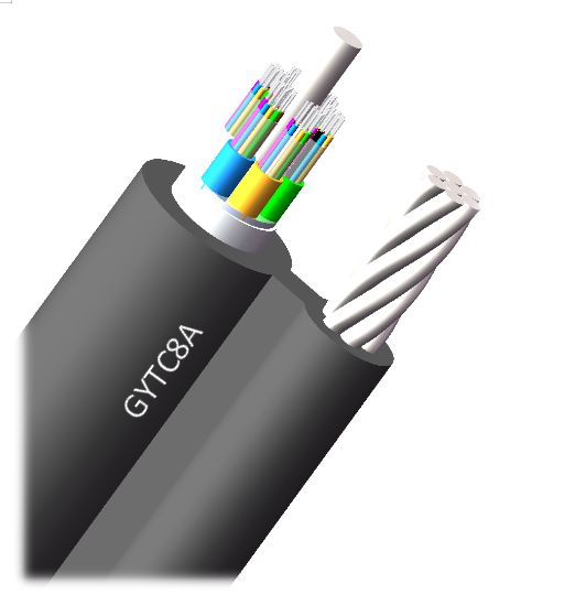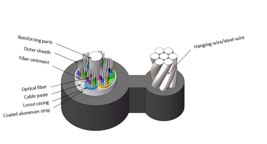 La structure du câble optique consiste à insérer des fibres optiques monomodes ou multimodes dans un tube lâche en plastique à module élevé rempli d'un composé étanche. Le centre du cœur du câble est un composant de renforcement métallique. Pour certains câbles optiques avec un certain nombre de cœurs, la structure du câble optique consiste à insérer des fibres optiques monomodes ou multimodes dans un tube lâche en plastique à module élevé rempli d'un composé étanche. Une couche de coussin en polyéthylène est extrudée et enroulée autour de la partie centrale de renforcement métallique. Les tubes lâches (et les cordes de remplissage) sont torsadés autour de la partie centrale de renforcement pour former un cœur de câble compact et rond. Les espaces à l'intérieur du cœur du câble sont remplis d'un composé bloquant l'eau. Une gaine collée en aluminium-polyéthylène est extrudée et enroulée à l'extérieur, et des suspentes en torons d'acier sont ajoutées pour former le câble.