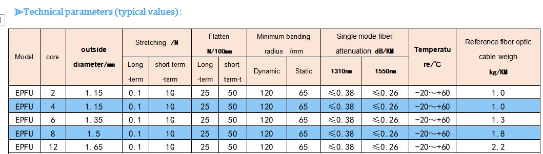 La structure du câble est constituée de fibres monomodes ou multimodes étroitement disposées (pouvant contenir des fibres de remplissage) formant une configuration régulière. Après durcissement à la résine en un faisceau de fibres, le faisceau est positionné au centre et extrudé avec une gaine en polyéthylène haute densité.