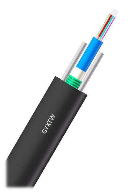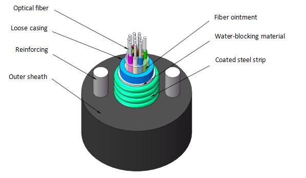 La structure du câble optique consiste à insérer des fibres optiques monomodes ou multimodes dans un tube lâche en plastique à haut module rempli d'un composé imperméable et à le placer au centre du câble. Des matériaux de blocage de l'eau sont placés entre l'extérieur du tube et la bande d'acier. Deux fils d'acier parallèles sont intégrés dans la gaine comme supports de renforcement, et le côté extérieur est extrudé et enveloppé d'une gaine collée en polyéthylène pour former le câble.